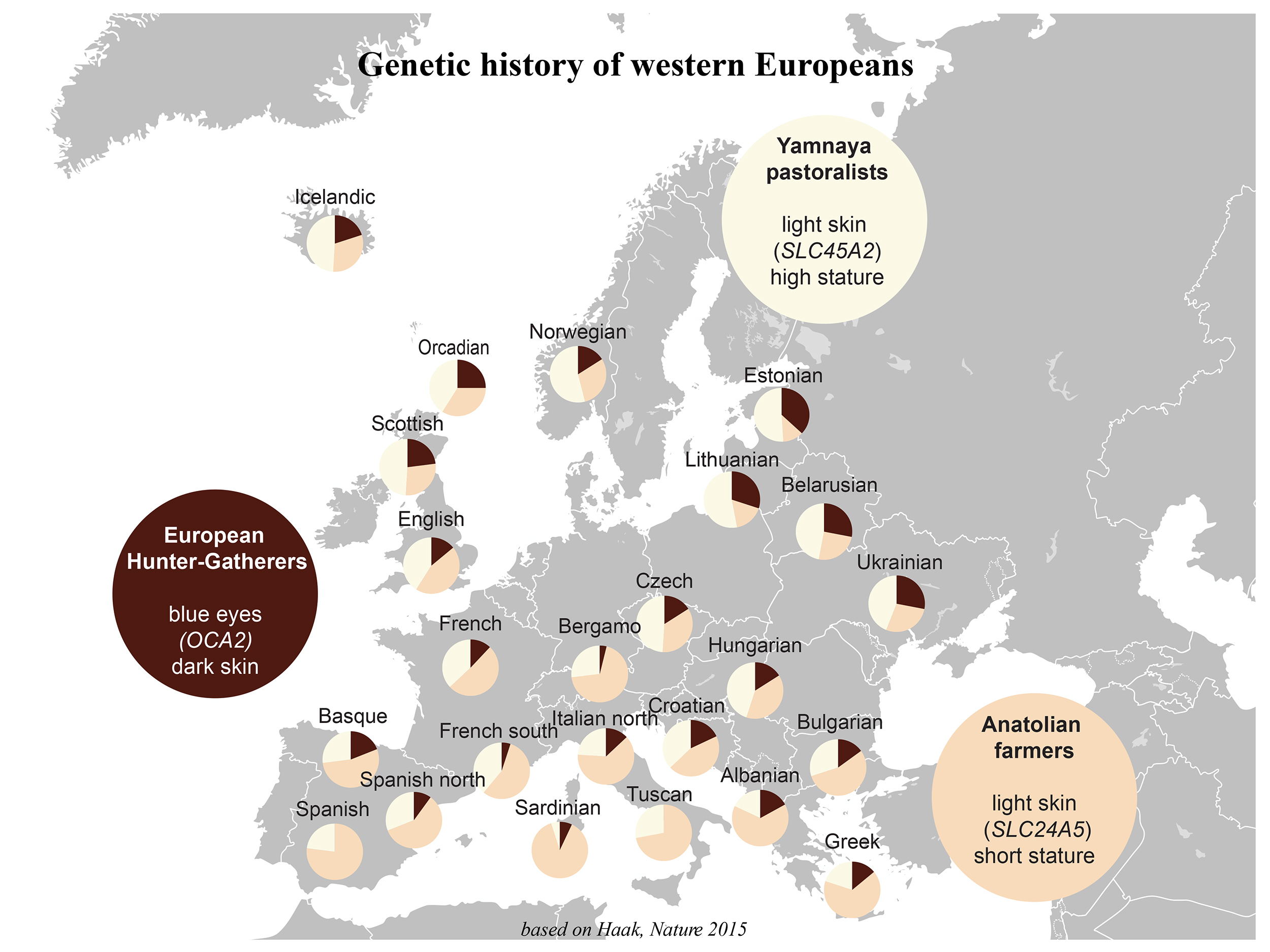 Gene variants for lighter skin were brought to western Europe far later by Anatolian farmers and by Yamnaya pastoralists from the northern Caucasus. Present European populations descend from these three ancient populations in varying proportions, which explains the variation of skin pigmentation, body stature and many other traits.