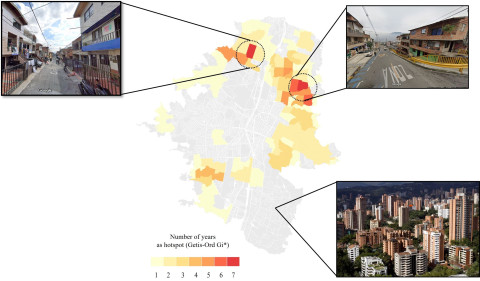 Tutkijat analysoivat yli 40 000 maantieteellisesti paikannettua denguetapausta vuosilta 2010–2020 ja havaitsivat, että puolet kaikista Medellínin denguetapauksista voitiin jäljittää vain 26 prosenttiin kaupungin asuinalueista. Nämä esiintyvyystihentymät sijaitsivat pääasiassa matala- ja keskituloisilla, tiheään rakennetuilla alueilla. Korkeamman sosioekonomisen aseman asuinalueilla, joilla oli myös paljon viheralueita, dengue-epidemioita esiintyi huomattavasti vähemmän.