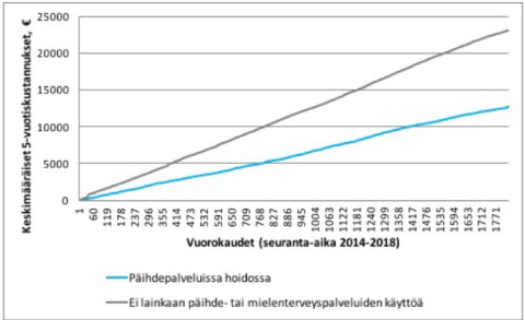 Vain päihdepalvelujen piirissä olevilla keskimääräiset kustannukset viisivuotisseurannassa olivat 53 prosenttia eli yli 12 000 euroa matalammat kuin päihdepalveluiden ulkopuolelle jääneillä. Päihdepalvelujen ulkopuolelle jääminen oli myös yhteydessä suurempaan kuolemanriskiin.
