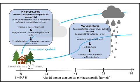 Atmospheric Chemistry and Physics -lehdessä juuri julkaistussa tutkimuksessa selvitettiin, miten pilvet ja sade vaikuttavat pienhiukkaspitoisuuksiin ja niiden ominaisuuksiin hiukkasten kulkeutuessa pohjoiselle havumetsävyöhykkeelle. Tutkimuksessa hyödynnettiin Hyytiälän SMEAR II-asemalla tehtyjä pitkiä aikasarjamittauksia pienhiukkasista ja HYSPLIT-mallin tuottamia ilmamassojen kulkeutumisreittejä kyseiselle mittausasemalle.