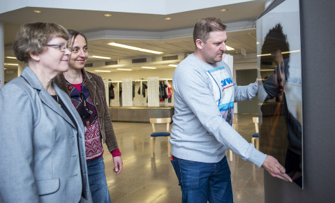 Marjatta Palander, Kaarina Mononen ja Sakari Röyskö pystyttävät valokuvanäyttelyä.