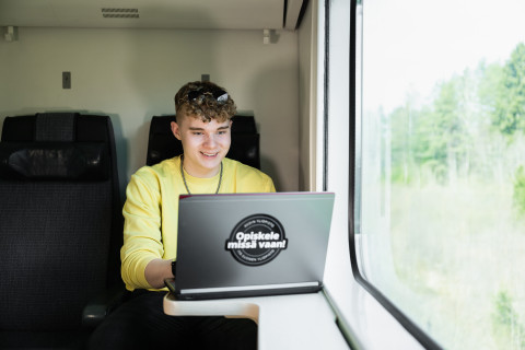 poika junassa opiskelee tietokoneella