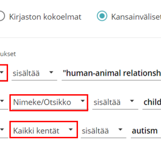 - Jos artikkelin tarkka otsikko on tiedossasi, voit kohdistaa haun Nimeke/Otsikko-kenttään, esim. "The librarian in Rowling's Harry Potter series" (valitse pudotusvalikosta kentäksi Nimeke/Otsikko-kenttä). Myös lainausmerkit otsikon ympärillä rajaavat hakutulosta.