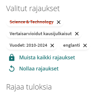- Rajaa hakutulosta oikean reunan rajauksilla haluamaasi suuntaan; esim. vertaisarvioidut artikkelit, saatavilla verkossa jne.