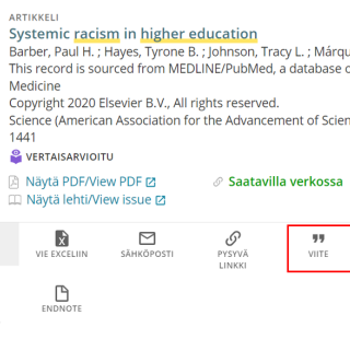 Jokaisen hakutuloksen vieressä on kuvakkeita (mm. kirjekuori ja nuppineula) sekä kolme pistettä. Kolmea pistettä klikkaamalla avautuu viitteen jatkokäsittelyvalikko (kts. esimerkkikuva). Löytyneen viitteen voi joko lähettää viitteidenhallintaohjelmaan (esim. Mendeley tai Endnote), sähköpostiin, kopioida pysyvänä linkkinä, tulostaa tai tallentaa RIS-muodossa esim. Zotero -viitteidenhallintaohjelmaa varten. Lue lisää viitteidenhallintaohjelmista kirjaston kotisivulta.